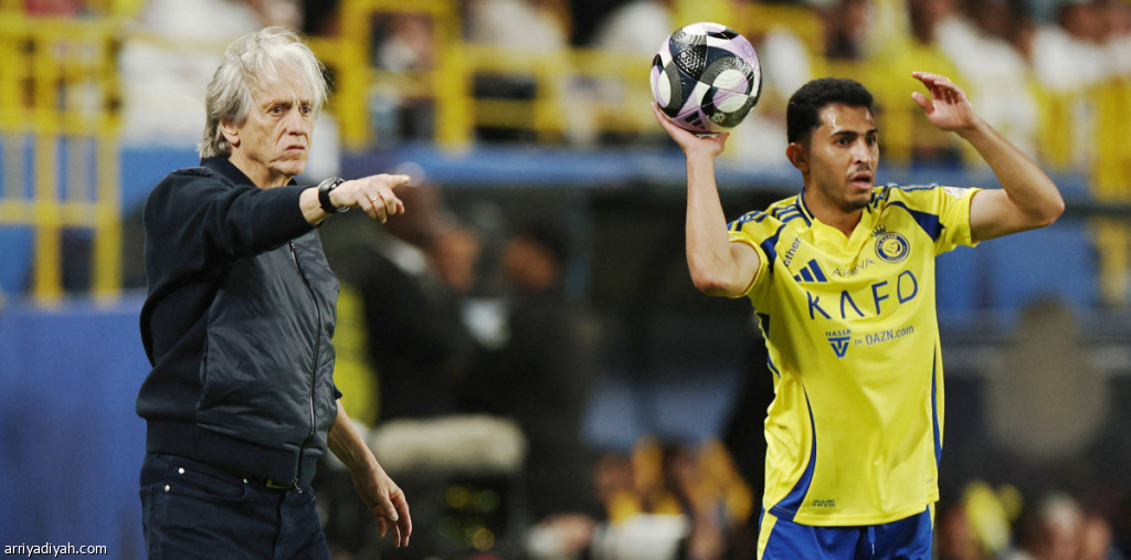 سلطان الغنام، ظهير أيمن النصر، يستعد لتنفيذ رمية جانبية، خلال ديربي الرياض، الجمعة، فيما يوجّه البرتغالي جورجي جيسوس، مدرب الهلال، لاعبيه (رويترز)