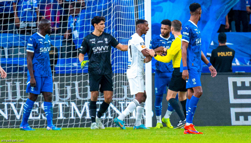 عبد الله رديف، مهاجم الاتفاق، يتجادل مع الحكم بحضور علي البليهي، مدافع الهلال، قبيل طرده في مباراة الفريقين، الجمعة، ضمن عاشر جولات الدوري تصوير: سعد الدوسري
