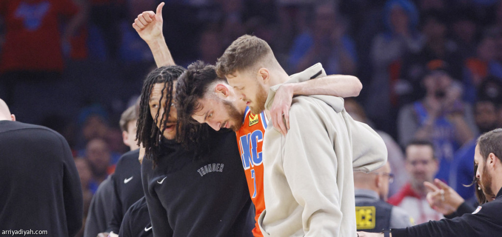 شيت هولمجرين، لاعب فريق أوكلاهوما سيتي ثاندر الأول لكرة السلة، الأحد، أثناء خروجه من الملعب بمساعدة زملائه بعد إصابته في مباراة جولدن ستيت وأريورز. (الفرنسية)