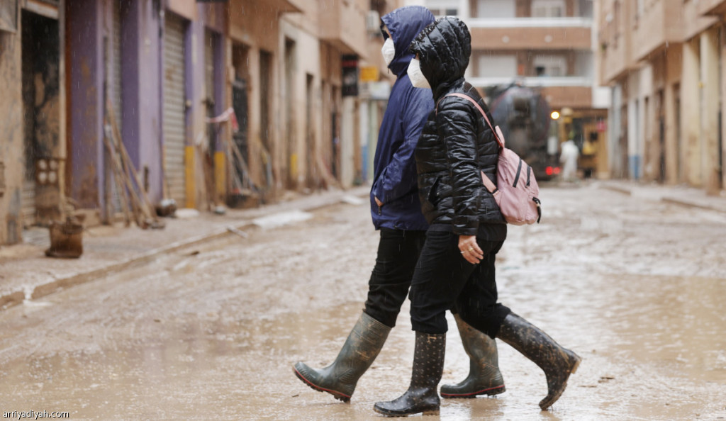 شخصان يسيران في أحد شوارع بلنسية، المدينة الإسبانية المتأثرة من الفيضانات. (الأوروبية)
