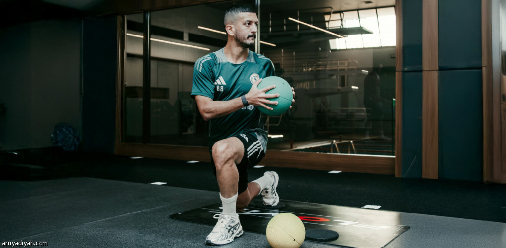 عبد الإله المالكي، لاعب وسط الاتفاق المعار من الهلال، يؤدي الاثنين تمارين لياقية داخل صالة الحديد في نادي الاتفاق (المركز الإعلامي- الاتفاق)