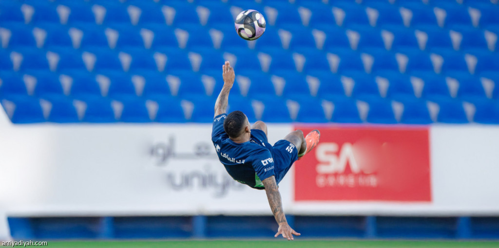 البرازيلي مالكوم، مهاجم فريق الهلال الأول لكرة القدم، يسدد مقصية خلال الحصة التدريبية، الأربعاء (المركز الإعلامي ـ الهلال)