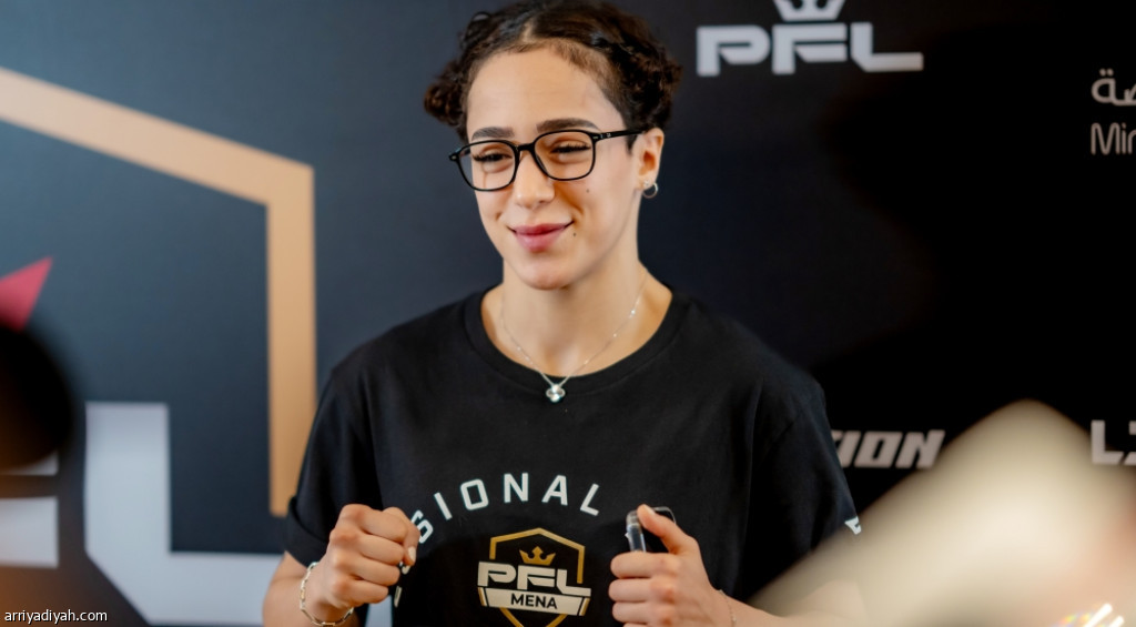 المقاتلة السعودية هتان السيف خلال المؤتمر الصحافي للبطولة، الثلاثاء (المركز الإعلامي ـ اللجنة المنظمة)