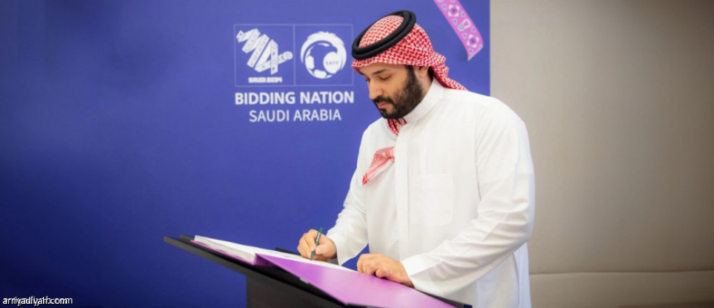 الأمير محمد بن سلمان لحظة توقيعه على ملف ترشح السعودية لاستضافة كأس العالم 2034 (واس)