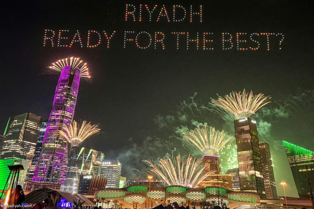 الألعاب النارية بمركز الملك عبد الله المالي في الرياض، الخميس، ضمن برنامج الاحتفالات المصاحب لفوز السعودية بتنظيم بطولة كأس العالم 2034 (الفرنسية)