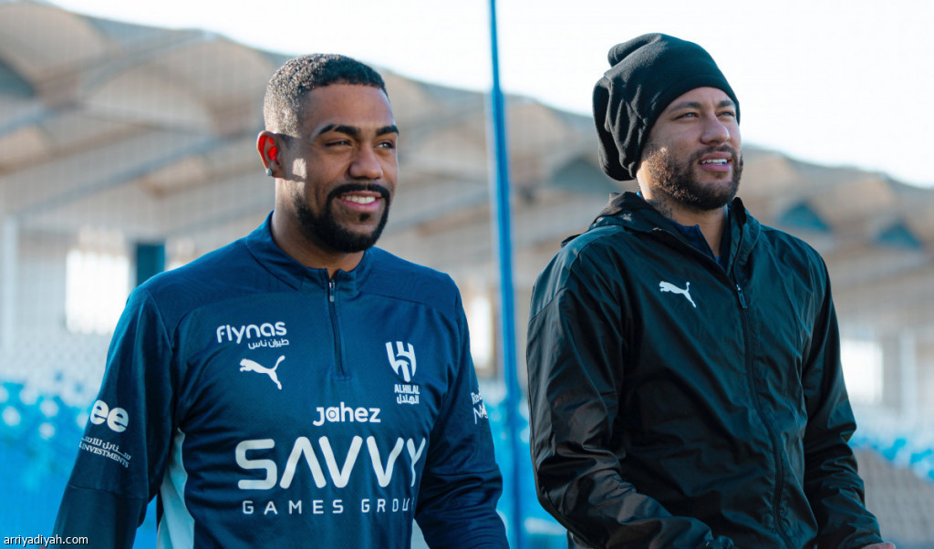 البرازيلي نيمار جونيور، مهاجم الهلال، وبرفقته مواطنه الجناح مالكوم فيليبي، في ملعب النادي، الإثنين، لأداء التدريبات (المركز الإعلامي ـ الهلال)