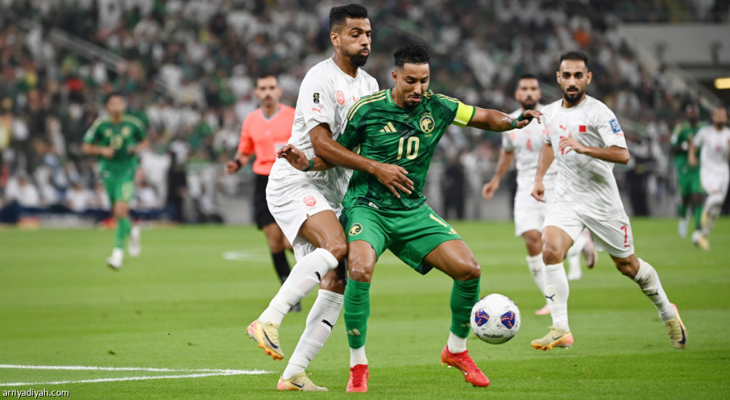 سالم الدوسري، قائد المنتخب السعودي الأول لكرة القدم، يحاول السيطرة على الكرة وسط مضايقة من لاعب بحريني خلال مباراة المنتخبين أكتوبر الماضي ضمن الدور الثالث من التصفيات الآسيوية المؤهلة إلى كأس العالم 2026 (أرشيفية)