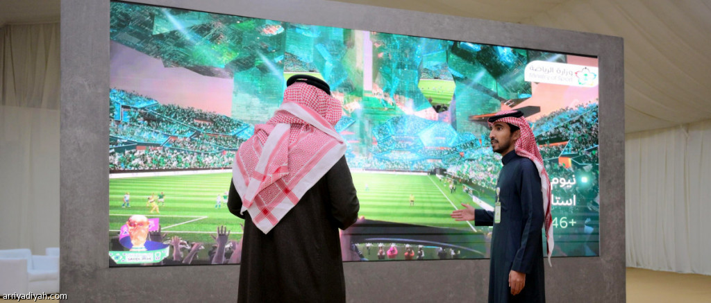 أحد الزوار يشاهد عرضًا لملاعب كأس العالم 2034 المقرر في السعودية خلال وجوده في جناح وزارة الرياضة بالصياهد (المركز الإعلامي ـ مهرجان الملك عبد العزيز للإبل)