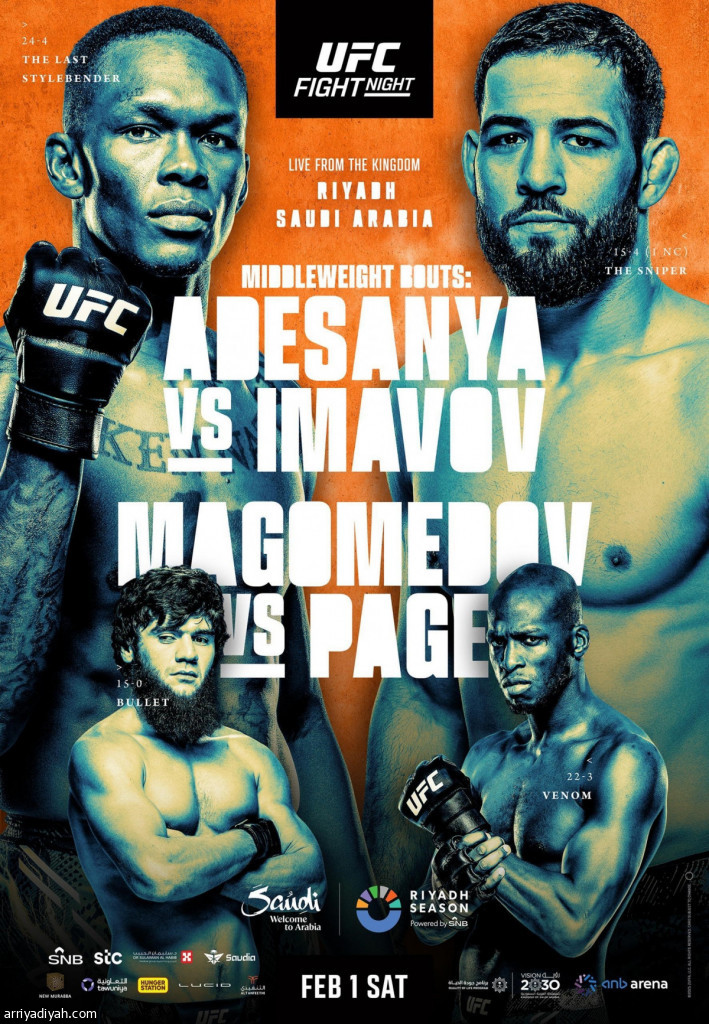 ويعود أديسانيا أحد أعظم مقاتلي UFC عبر التاريخ، إلى الحلبة بعد مواجهته الأخيرة على اللقب أمام دريكوس دو بليسيس في وقت سابق العام الجاري، حيث يسعى لاستعادة هيمنته عبر تحقيق انتصار حاسم على إماموف، بينما يدخل إماموف، المقاتل الفرنسي ذو الأصول الداغستانية، المواجهة بحماس كبير بعد فوزه على بريندان ألين، ويأمل في الإطاحة بأسطورة مثل أديسانيا في ليلة تعد بأن تكون استثنائية