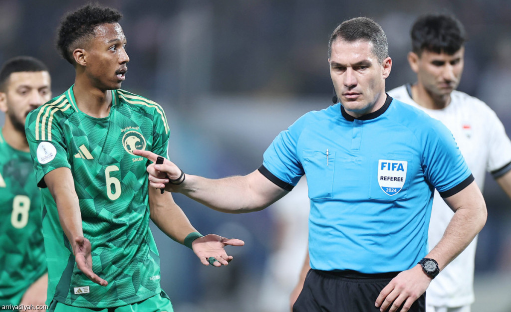 ناصر الدوسري، لاعب وسط المنتخب السعودي الأول لكرة القدم، لحظة معاقبته بإنذار من الروماني إشتفان كوفاتش، حكم مباراة الأخضر والعراق، السبت الماضي، في كأس الخليج تصوير: سعد العنزي