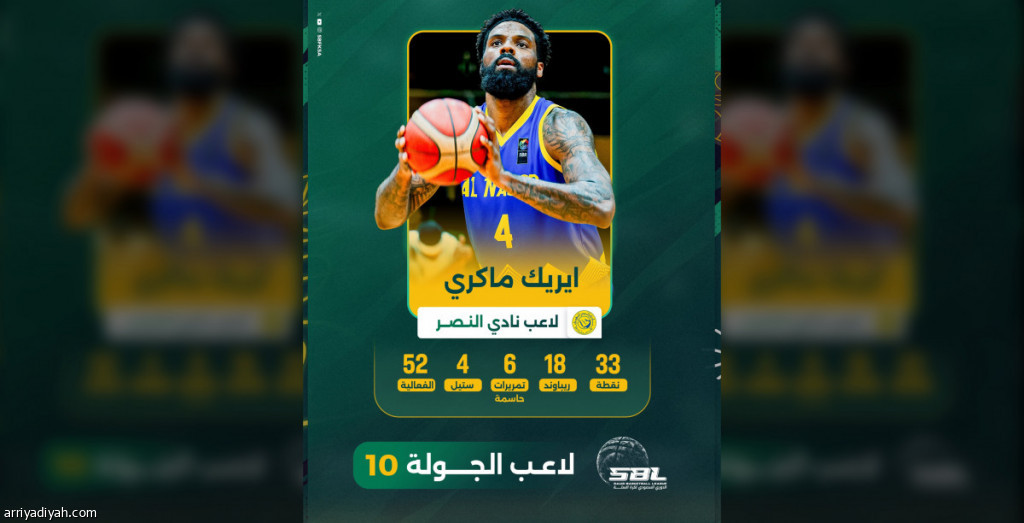 خطف الأمريكي إيريك ماكري، لاعب فريق النصر الأول لكرة السلة، الأربعاء، نجومية الجولة العاشرة من الدوري السعودي الممتاز، حسبما أعلن عنه حساب البطولة الرسمي.