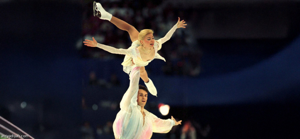 الزوجان الروسيان يفجينيا شيشكوفا وفاديم نوموف خلال منافسة الأزواج في بطولة العالم للتزلج الفني على الجليد بإدمونتون في كندا، 19 مارس 1996 (رويترز)