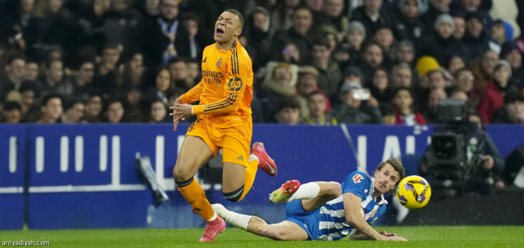 كارلوس روميرو مدافع إسبانيول يعترض الفرنسي كليان مبابي مهاجم الريال في اللعبة التي اعترض عليها النادي الملكي (الأوروبية)