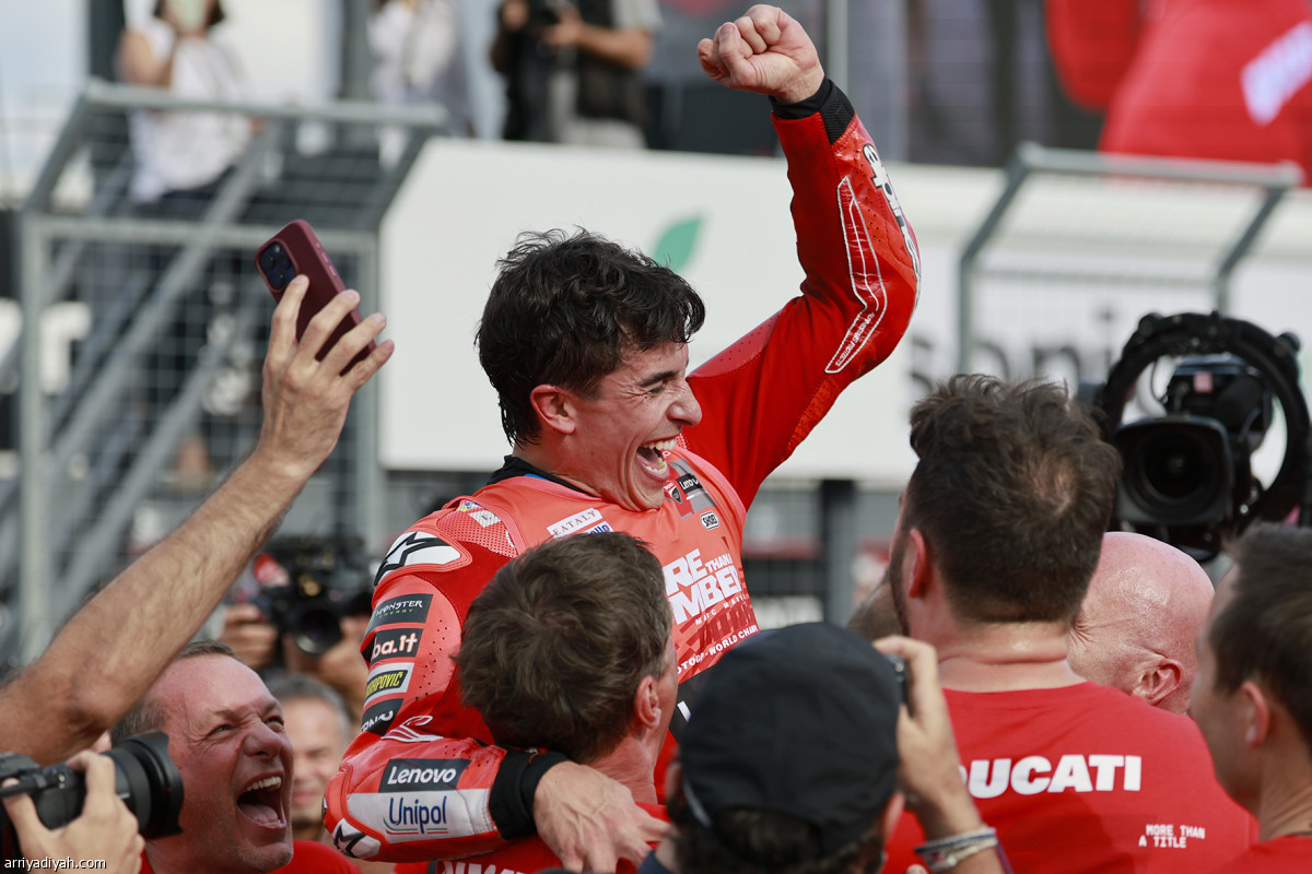 حسم الدّراج الإسباني مارك ماركيز، سائق فريق دوكاتي، لقب بطولة العالم للدرَّاجات النارية فئة «موتو جي بي» للمرة السابعة في مسيرته، والأولى منذ 2019، بعد حلوله ثانيًا الأحد في جائزة اليابان الكبرى، وقبل خمس جولات من نهاية الموسم. (الأوروبية ورويترز)