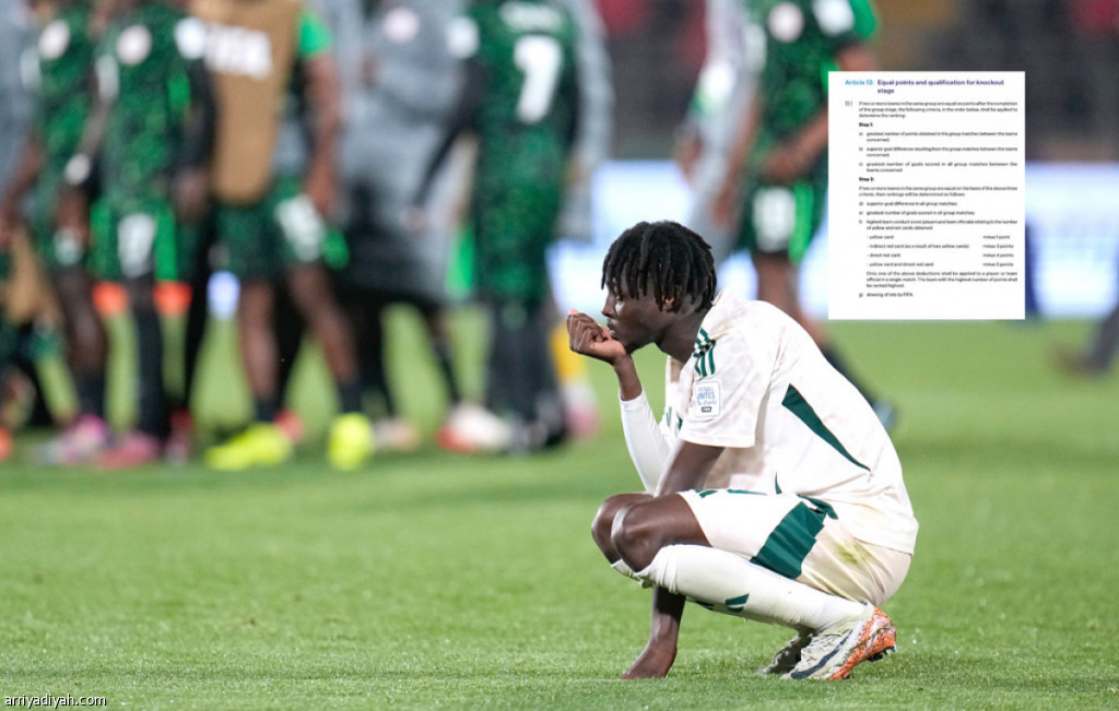 وبحسب لوائح البطولة، لا ينظر إلى فارق الأهداف عند التساوي بالنقاط، بل تعتمد نتيجة المواجهات المباشرة، ما يعني أن الأخضر سيتذيل الترتيب، حتى لو انتصر على النرويج، وخسرت نيجيريا من كولومبيا في الجولة الأخيرة، الإثنين.