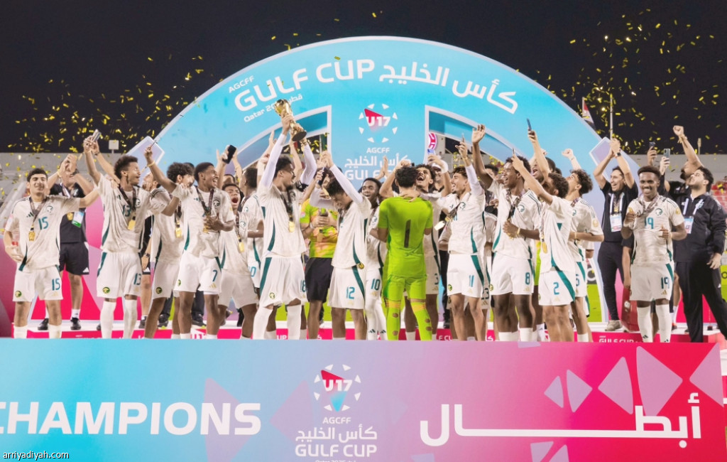 المنتخب السعودي تحت 17 عامًا لكرة القدم يحتفل بتحقيق كأس الخليج للناشئين بعد فوزه في النهائي على الإمارات، الجمعة (المركز الإعلامي ـ اتحاد كأس الخليج العربي والمنتخب السعودي)