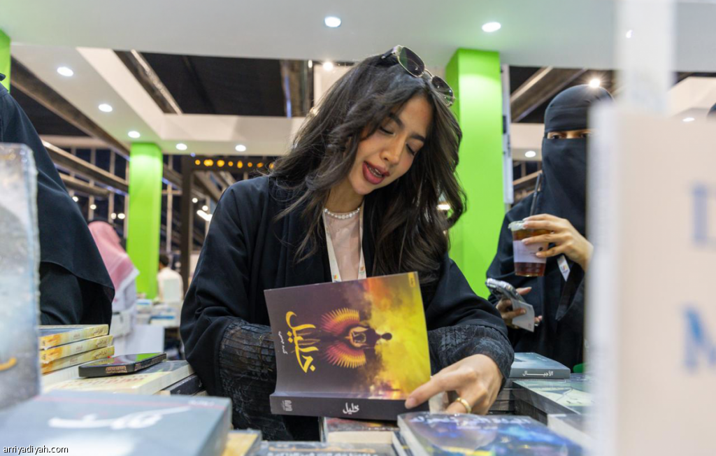 الكاتبة كندة جمبي مع روايتها الجديدة «خليل» خلال حضورها في معرض الرياض الدولي للكتاب 2025 (المركز الإعلامي - معرض الكتاب)