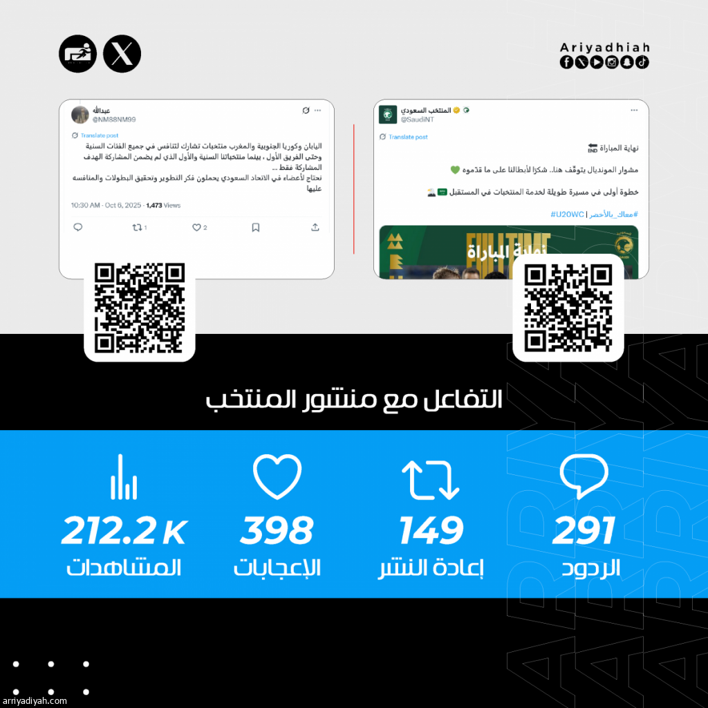 لم تهدأ «التعليقات» على منشور حساب المنتخب السعودي الرسمي عبر منصة التدوينات القصيرة «إكس»، الذي سجّل تفاعلًا تجاوز الـ212.2 ألف مشاهدة، و398 إعجابًا، و291 ردًا، و149 إعادة نشر، وذلك في أقل من 24 ساعة.