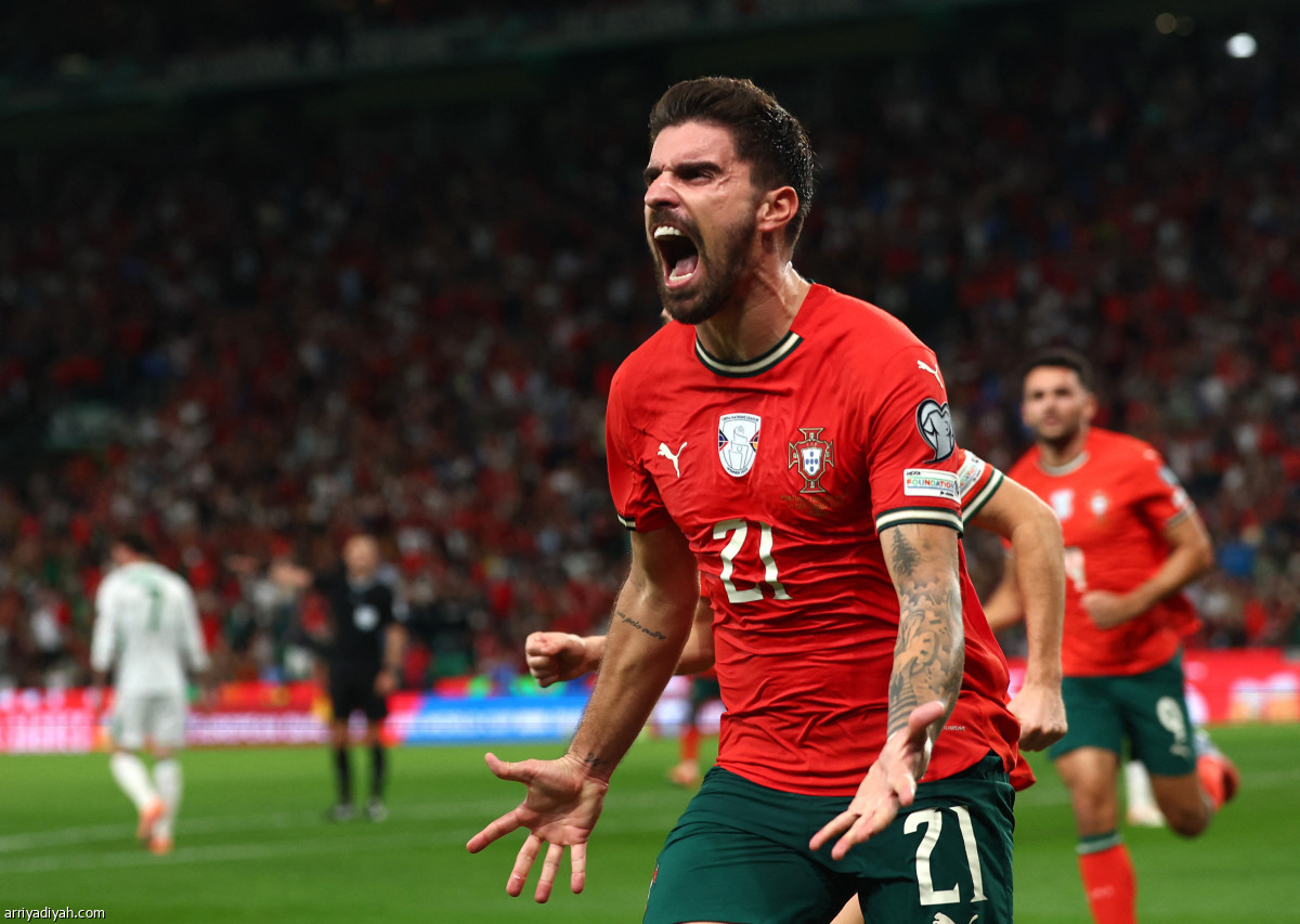 احتفل البرتغالي روبن نيفيش، محترف الهلال، بعد تسجيله هدف منتخب بلاده الوحيد أمام إيرلندا ضمن الجولة الثالثة من تصفيات كأس العالم، لحساب المجموعة السادسة (رويترز)