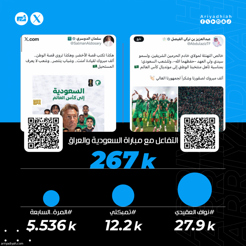 وتفاعل سلمان الدوسري، وزير الإعلام، مع إعلان تأهل «الصقور» إلى مونديال 2026، وكتب: «هكذا تكتب قصة الأخضر، وهكذا تروى قصة الوطن.. ألف مبروك لقيادة آمنت.. وشباب ينتصر.. وشعب لا يعرف المستحيل».