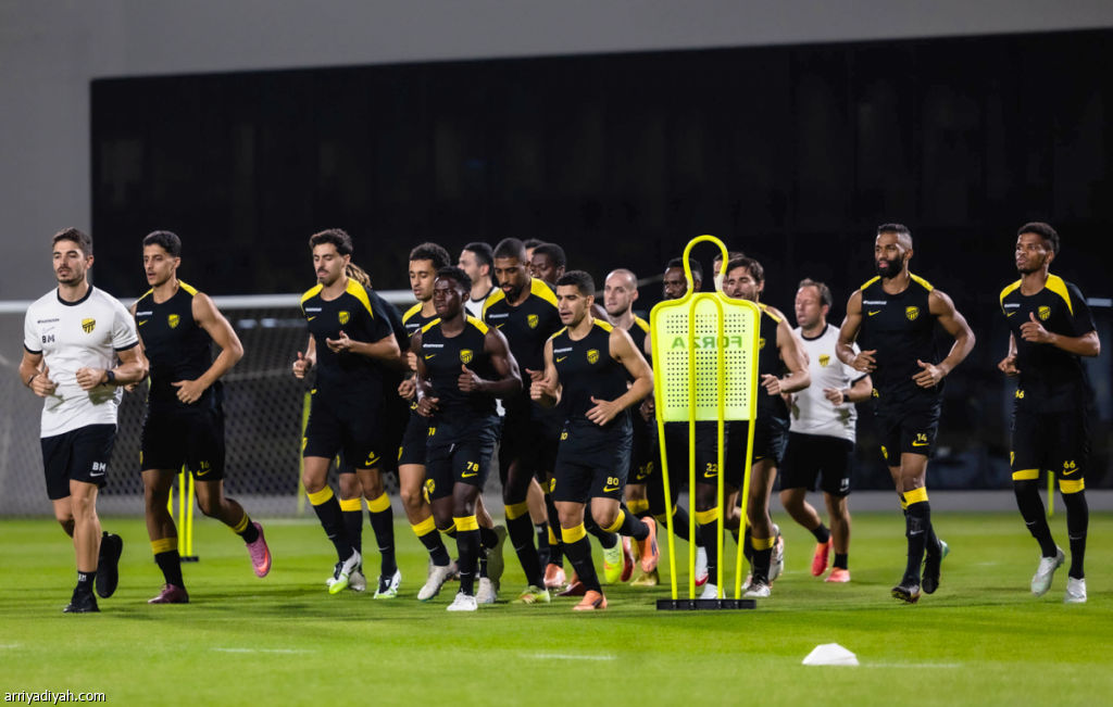 لاعبو فريق الاتحاد الأول لكرة القدم خلال حصة تدريبية، السبت، على ملعب النادي استعدادًا للقاء الشرطة العراقي (المركز الإعلامي ـ الاتحاد)