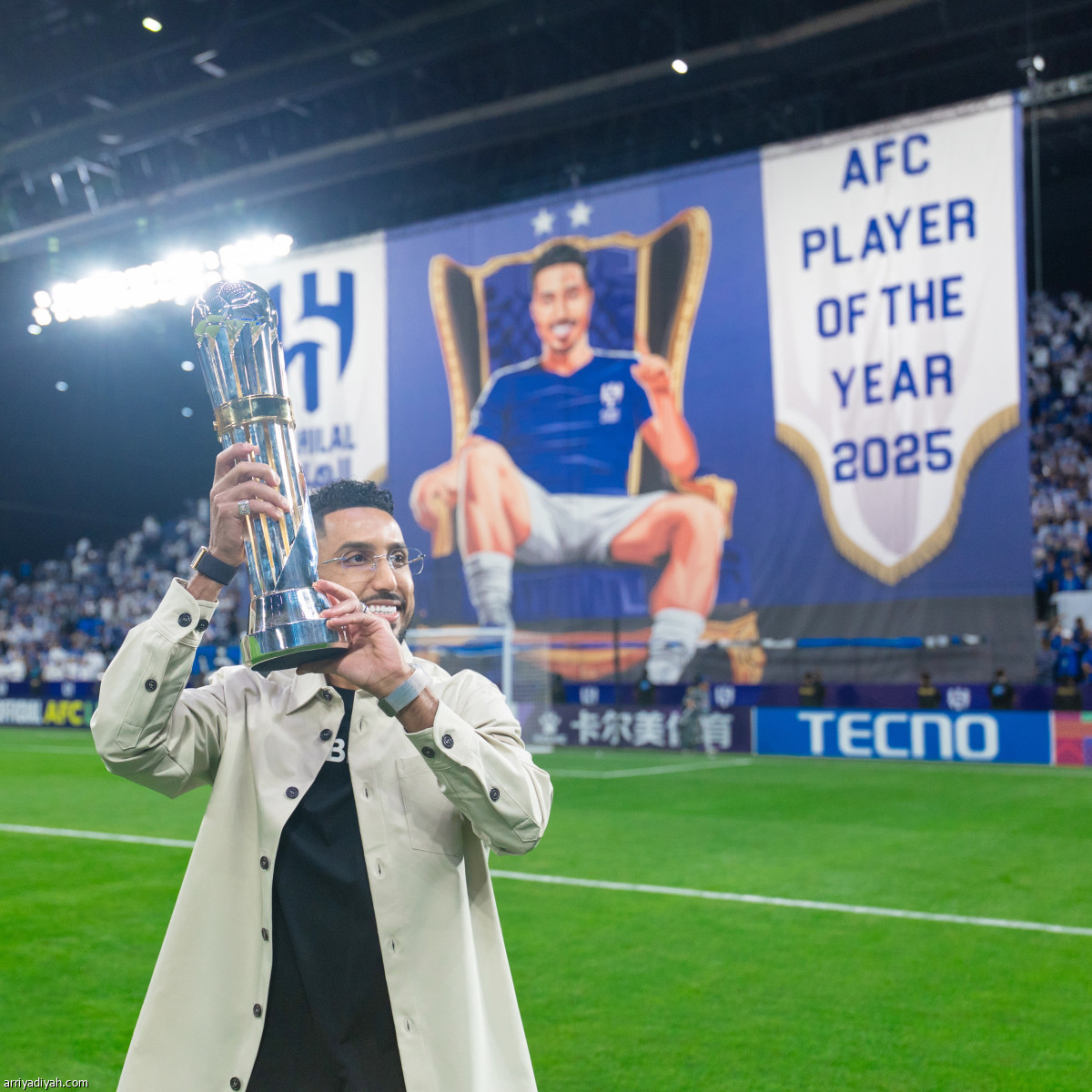 نظَّم نادي الهلال، قبيل انطلاق مباراة الفريق الأول لكرة القدم مع ضيفه السد القطري، الثلاثاء، على ملعب «المملكة أرينا» في الرياض، ضمن منافسات دوري أبطال آسيا للنخبة، احتفالية تكريم لسالم الدوسري بمناسبة فوزه بجائزة أفضل لاعب في القارة لعام 2025.. وعرض الملعب لوحة عملاقة مرسوم عليها سالم وإلى جواره عبارة أفضل لاعب في آسيا 2025 باللغة الإنجليزية، فيما دخل قائد الأزرق حاملًا الجائزة واحتفل بها أمام الجماهير الحاضرة.. ومن جهته قدَّم الأمير نواف بن سعد، رئيس شركة النادي، هديّة تذكارية للدوسري على أرض الملعب (المركز الإعلامي ـ الهلال)