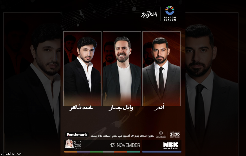 ويأتي الحفل بتنظيمٍ من شركة «بنش مارك»، ليواصل موسم الرياض تقديم أمسياتٍ طربيةٍ، تجمع أبرز نجوم الوطن العربي في أجواءٍ موسيقيةٍ، تعكس روح الترفيه السعودي المتجدِّد ضمن رؤية 2030.