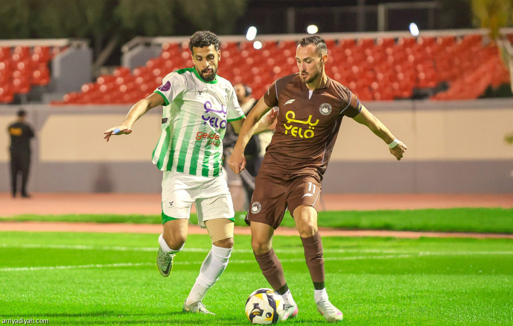 الألباني إيرالدو تشيناري، محترف الجبلين، وسيف القشطة، ظهير الأنوار، يتنافسان على الكرة. (المركز الإعلامي ـ دوري يلو)