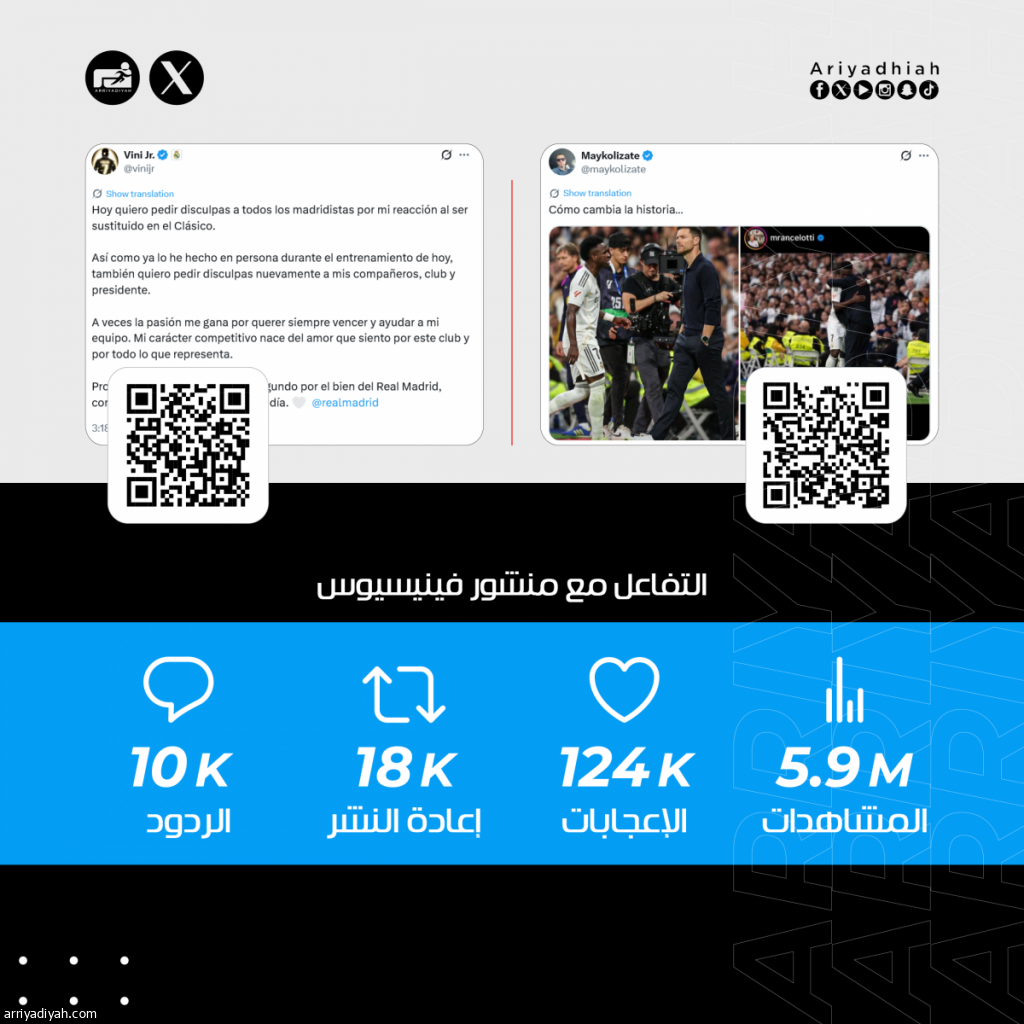 وسجّل منشور فينيسيوس تفاعلًا تجاوز الـ5.9 مليون مشاهدة، 124 ألف إعجاب، 18 ألف إعادة نشر، و10 آلاف رد، في ثلاث ساعات فقط.