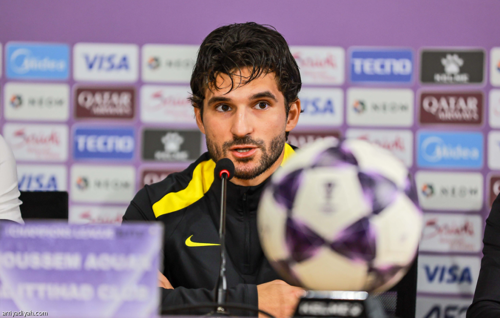 الجزائري حسام عوّار، لاعب وسط الاتحاد، يتحدث خلال مؤتمر صحافي، الإثنين، عشية مواجهة الفريق مع ضيفه الشارقة الإماراتي ضمن رابع جولات مجموعة الغرب في دوري أبطال آسيا للنخبة تصوير: محمد المانع