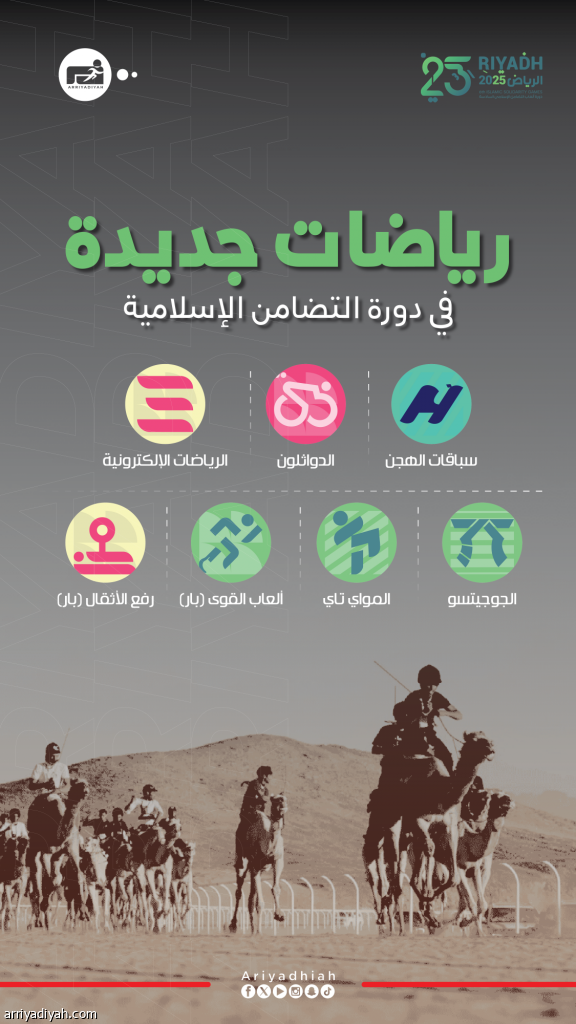 تتَّجه أنظار العالم الإسلامي إلى الرياض، العاصمة السعودية، التي تستضيف النسخة السادسة من دورة ألعاب التضامن الإسلامي 2025 بمشاركة أكثر من 3000 رياضي ورياضيةٍ من 57 دولةً، فيما تشهد الدورة العام الجاري إضافة سبع رياضاتٍ جديدةٍ، تُدرَج للمرة الأولى في جدول المنافسات.