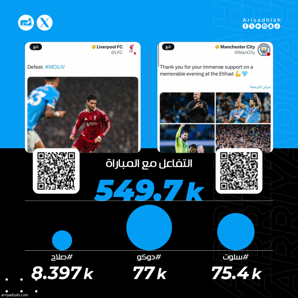وشهدت قائمة الترند العالمي في المنصة حضور اسم الهولندي أرني سلوت، مدرب ليفربول، في 75.4 ألف منشور، والبلجيكي جيرمي دوكو، لاعب سيتي وصاحب الهدف الثالث، بـ 77 ألفًا.