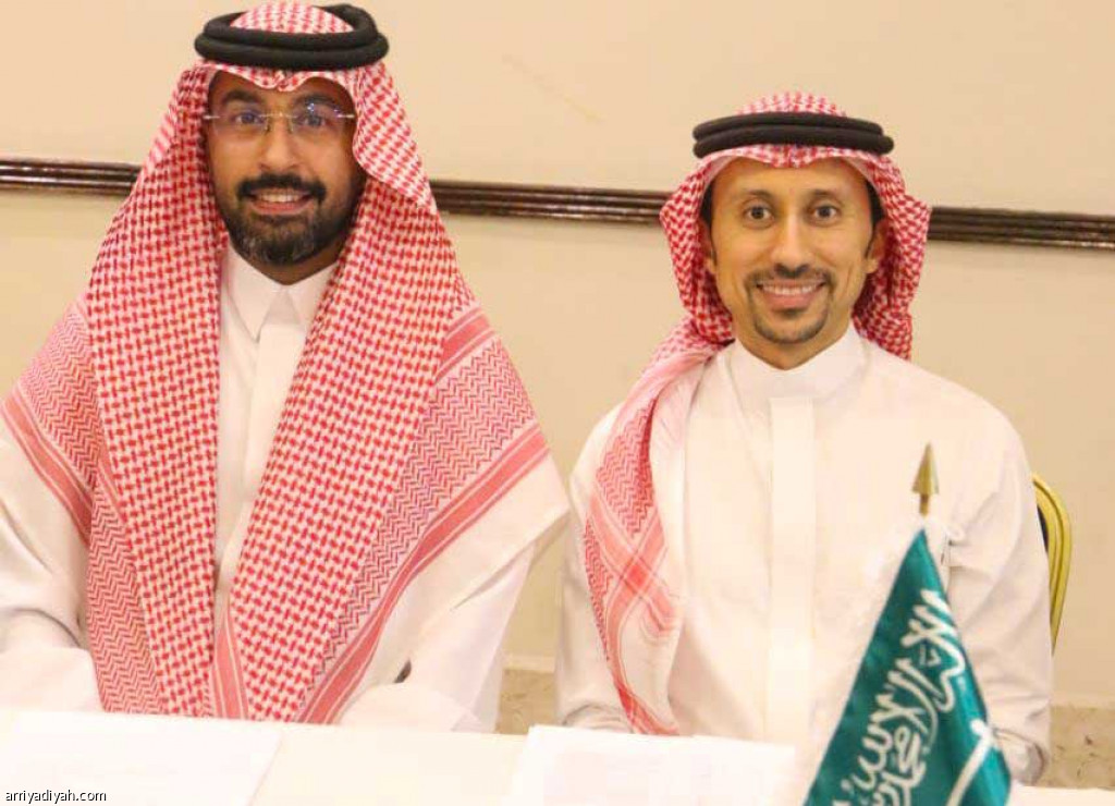 أحمد بنّان نائب رئيس مجلس إدارة الاتحاد السعودي للجمباز وفهد الفرج المدير التنفيذي خلال حضورهما اجتماع الجمعية العمومية للاتحاد العربي للجمباز