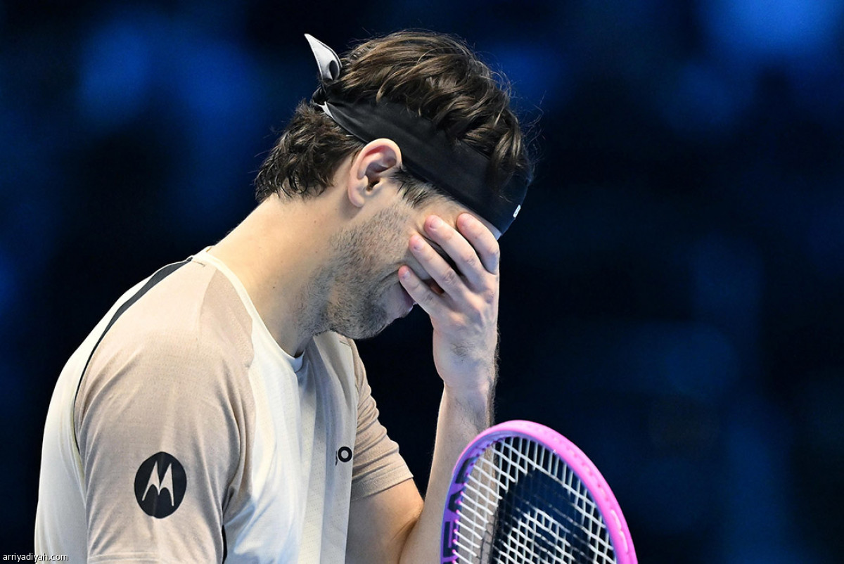 تحسَّر الأمريكي تايلور فريتز بعد خسارته من الأسترالي أليكس دي مينو «7ـ6 و6ـ3»، وخروجه من منافسة البطولة الختامية لموسم تنس الرجال (وكالات)