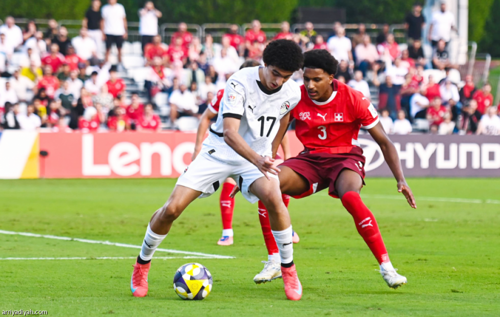 عبد العزيز الزغبي، جناح مصر، في صراع على الكرة مع أوليفر مامبوا، ظهير أيسر سويسرا، خلال مباراة المنتخبين الجمعة ضمن منافسات كأس العالم للناشئين (المركز الإعلامي ـ الاتحاد المصري)