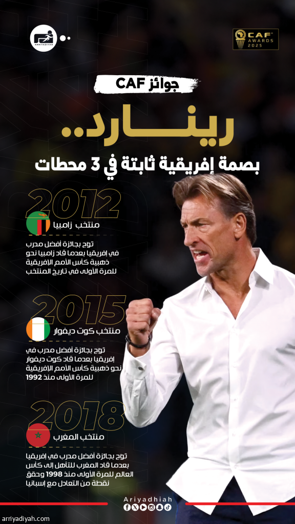 لن تُغيِّر نتيجة الحفل السنوي للاتحاد الإفريقي لكرة القدم، المقرَّر تنظيمه مساء الأربعاء، من ملامح الزعامة التدريبية في القارة السمراء حتى مع الكشف عن الفائز بجائزة أفضل مدرب إفريقي لعام 2025، إذ إن الأسماء العشرة المرشَّحة، التي أُعلن عنها أكتوبر الماضي، تضيف قوةً للمنافسة، لكنَّها لا تنتزع المكانة التي يحتفظ بها الفرنسي هيرفي رينارد، مدرب المنتخب السعودي الأول لكرة القدم، الذي ظفر بالجائزة ثلاث مراتٍ مع ثلاثة منتخباتٍ إفريقيةٍ مختلفةٍ.