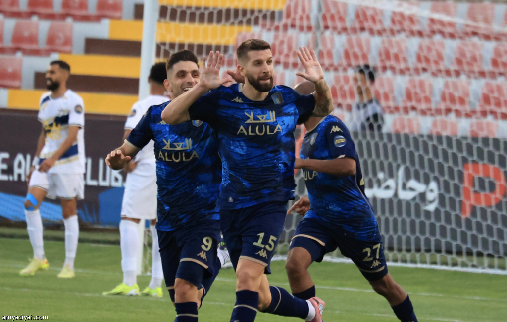 الصربي ماتيا ناستاسيتش لاعب فريق العلا ينطلق فرحًا بعد تسجيله هدفًا فرض به التعادل 1-1 على جدة، السبت (المركز الإعلامي - دوري يلو)