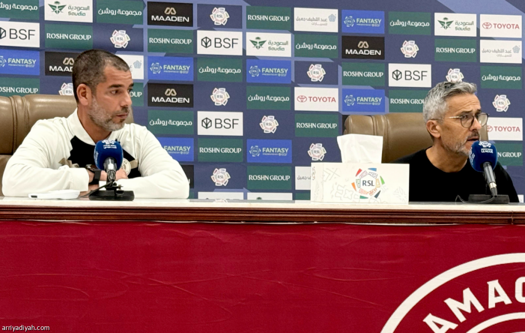 البرتغالي أرماندو إيفانجليستا، مدرب فريق ضمك الأول لكرة القدم، خلال حديثه في المؤتمر الصحافي تصوير: عبد الرحمن أبو محروس