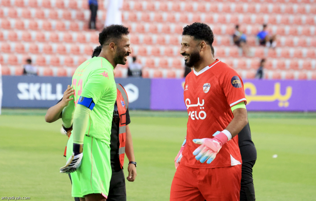 ياسر المسيليم حارس مرمى فريق جدة ومحمد العويس حارس مرمى العلا قبل مواجهة الفريقين، السبت، في تاسع جولات دوري «يلو» (المركز الإعلامي - دوري يلو)