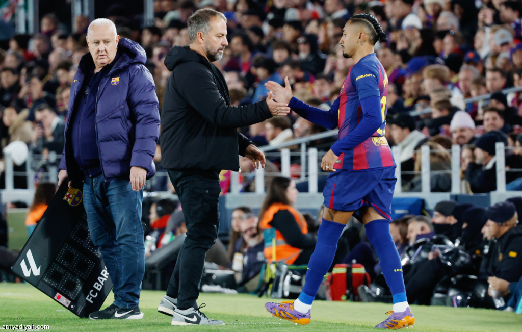 الألماني هانزي فليك، مدرب فريق برشلونة، يصافح الجناح البرازيلي رافينا العائد من الإصابة بعد مشاركته في مباراة أتلتيك بلباو، السبت (أسوشيتد برس)