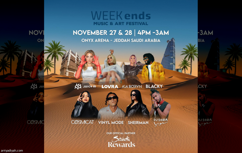 تنطلق فعاليات مهرجان «ويكندز» للموسيقى والفنون في جدة، الخميس المقبل، بمشاركة 22 فنانًا ونجمًا عالميًا ومحليًا، على مدار يومين متتاليين 27-28 نوفمبر، في «أونيكس أرينا».