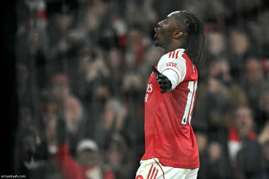 إيبيريتشي إيزي لاعب فريق أرسنال الأول لكرة القدم يحتفل بتسجيله الهدف الرابع لفريقه «هاتريك» خلال مواجهة توتنام ضمن الدوري الإنجليزي الممتاز، الأحد (الفرنسية)