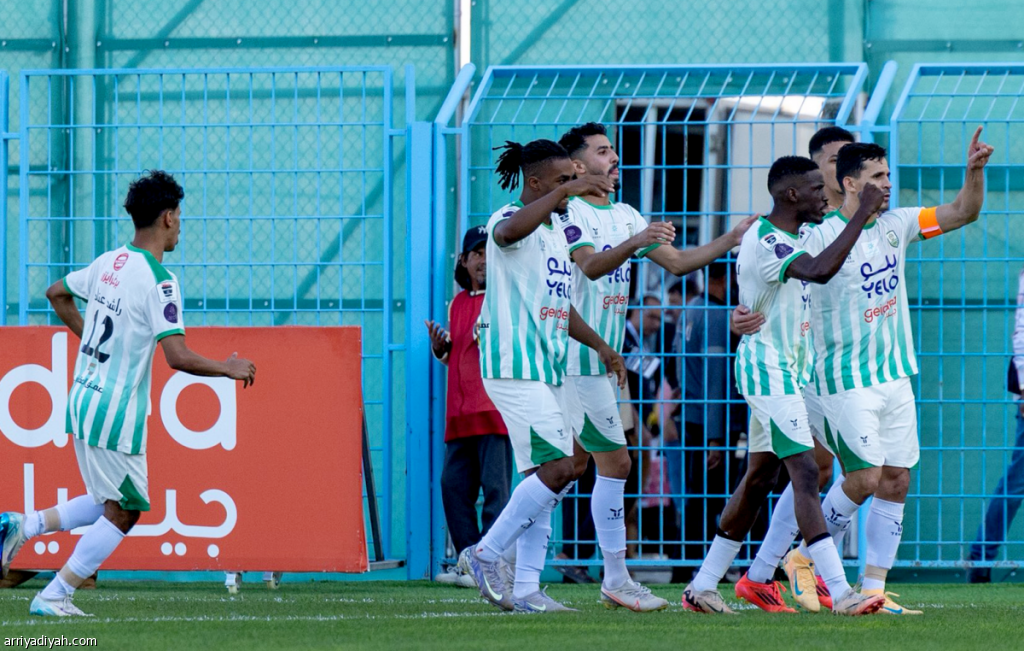 لاعبو فريق الأنوار يحتفلون مع زميلهم تياجو بيزيرا بعد تسجيله الهدف الأول في لقاء الزلفي، الجمعة، ضمن عاشر جولات دوري «يلو» لأندية الدرجة الأولى (المركز الإعلامي - دوري يلو)