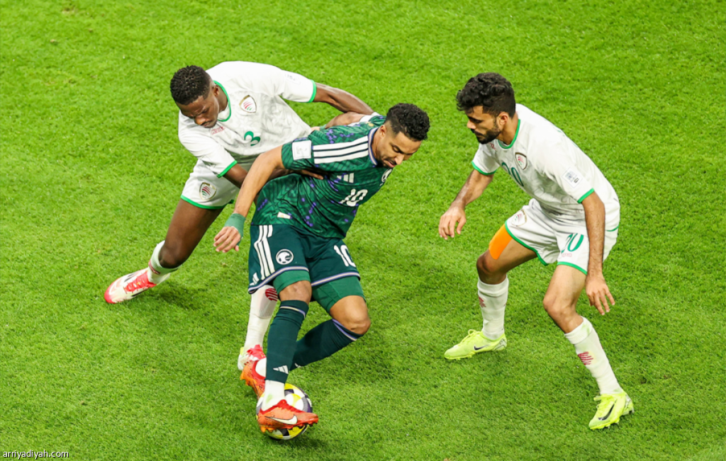 سالم الدوسري، قائد المنتخب السعودي، محاصرًا بين ثاني الرشيدي وصلاح اليحيائي، ثنائي عُمان، خلال موقعة الجولة الأولى من ثاني مجموعات كأس العرب «فيفا قطر 2025»، الثلاثاء، على ملعب المدينة التعليمية في الريان تصوير: سعد العنزي