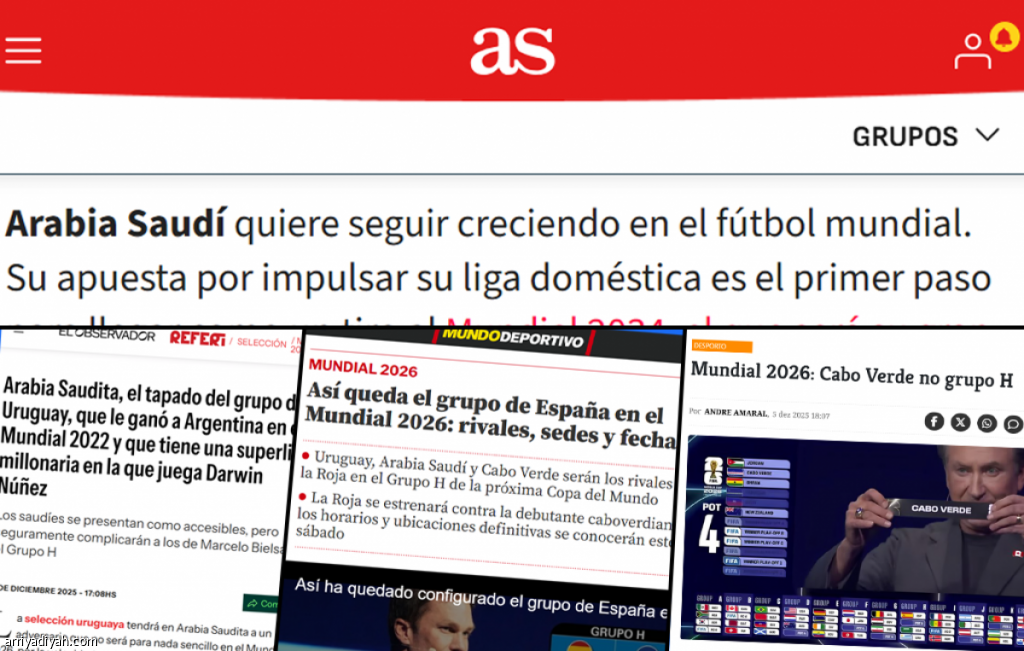 تابعت الصحافة في إسبانيا والأوروجواي والرأس الأخضر، السبت، باهتمام بالغ نتائج قرعة دور المجموعات لكأس العالم 2026، التي وقعتها مع المنتخب السعودي الأول لكرة القدم في المجموعة الثامنة.