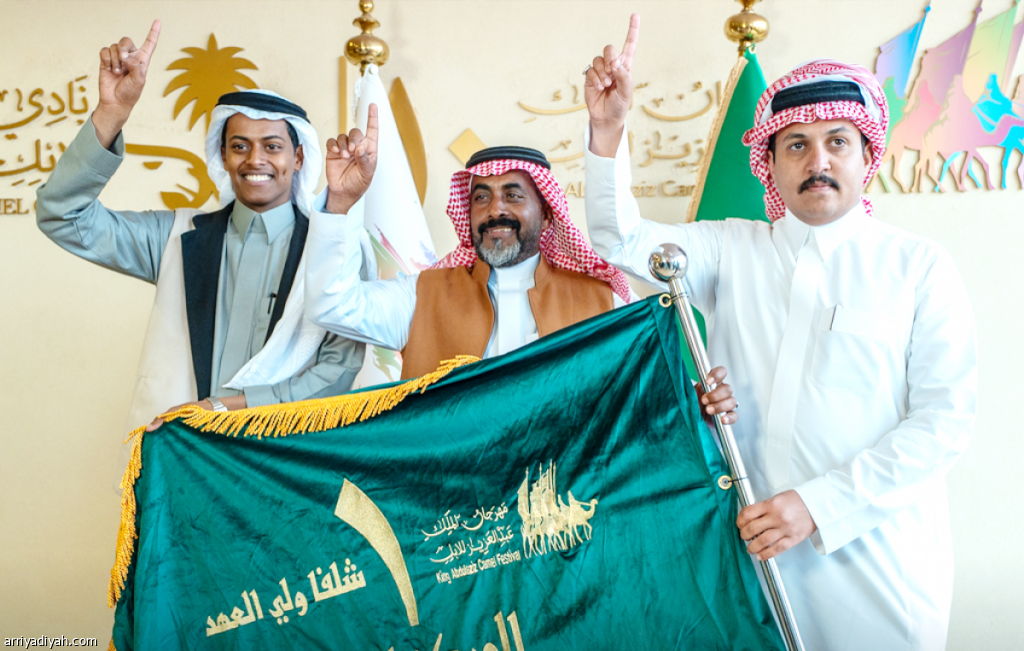 يزيد المطيري «قعيد» إلى جانب والده محمد المطيري وفهد السليس، مستشار إبله، بعد التتويج بشلفا ولي العهد لون الحمر الخميس (المركز الإعلامي ـ نادي الإبل)
