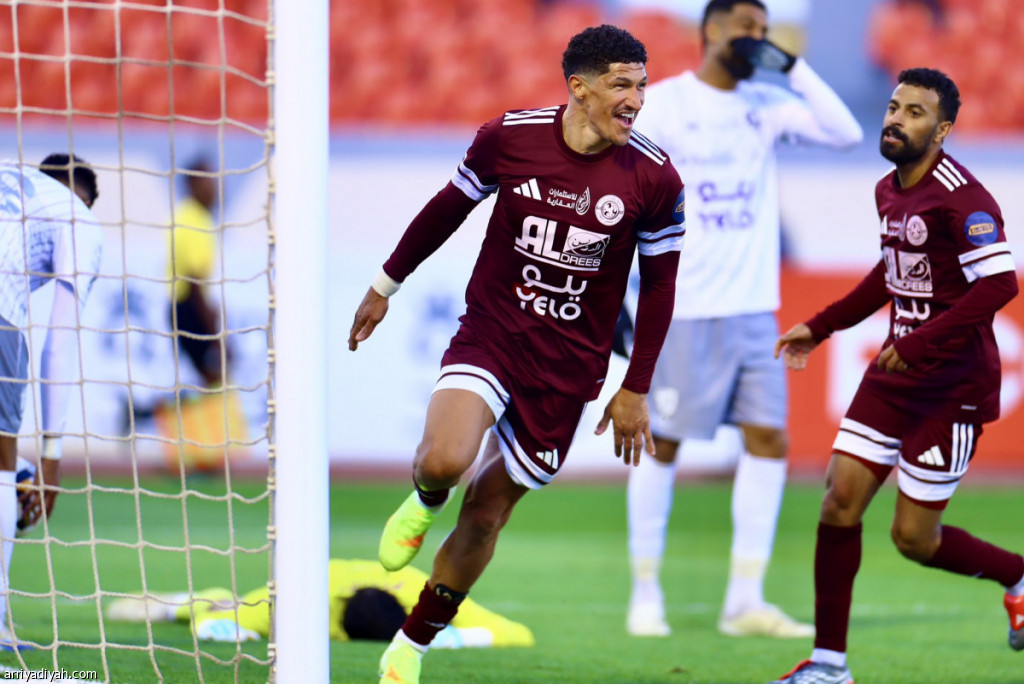 البرازيلي لوفانور هنريكي، لاعب الفيصلي، يحتفل بعد تسجيله هدفًا في مرمى الطائي خلال مواجهة جرت في حائل، السبت (المركز الإعلامي ـ الفيصلي)