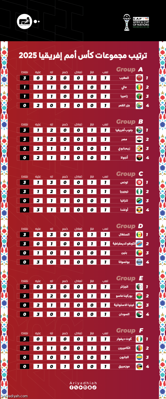 جدول ترتيب كأس الأمم الإفريقية بعد الجولة الأولى