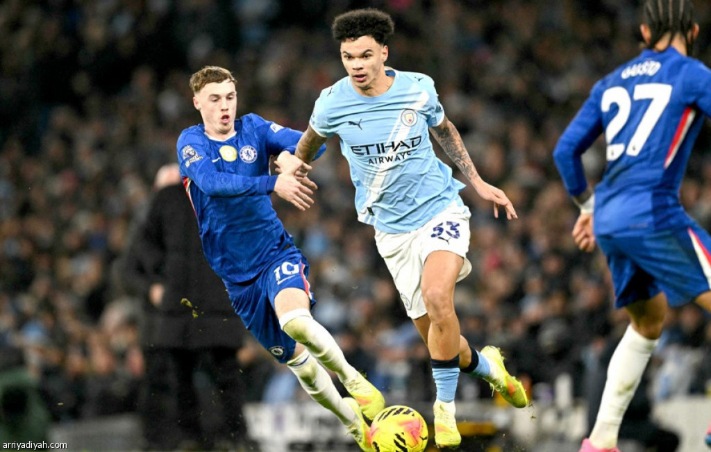 نيكو أوريلي لاعب خط وسط مانشستر سيتي يتنافس مع كول بالمر لاعب خط وسط تشيلسي، خلال مباراة الدوري الإنجليزي الممتاز لكرة القدم، الأحد (الفرنسية)