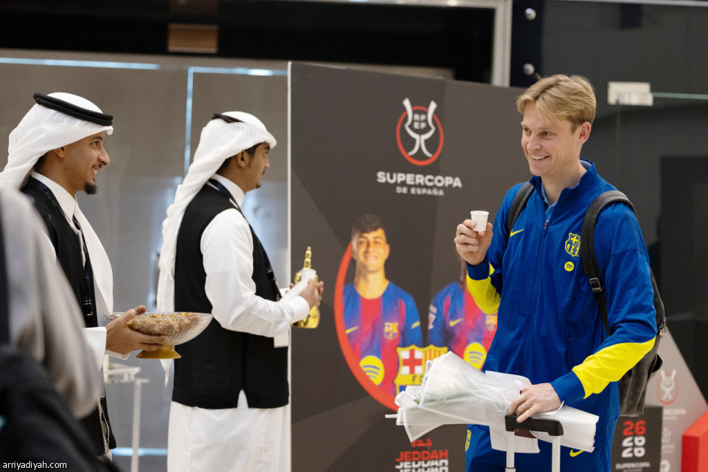 فرانكي دي يونج لاعب وسط فريق برشلونة لدى وصوله مع الفريق الأول إلى جدة الإثنين للمشاركة في بطولة السوبر الإسباني.. وفي باقي الصور يظهر خوان لابورتا رئيس النادي والمدرب هانزي فليك ولاعبي الفريق بيدري ورافينيا ويامين يامال (وزارة الرياضة)